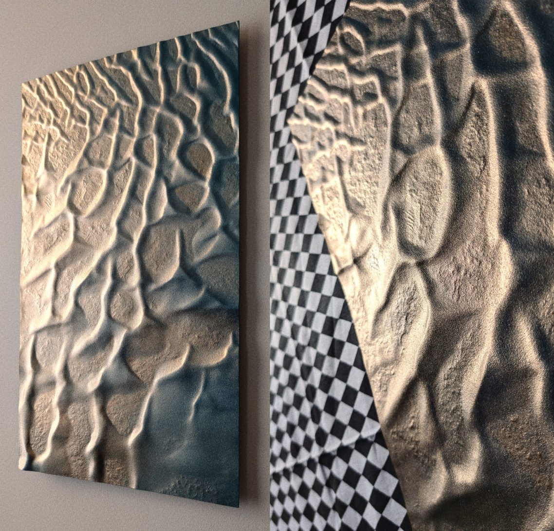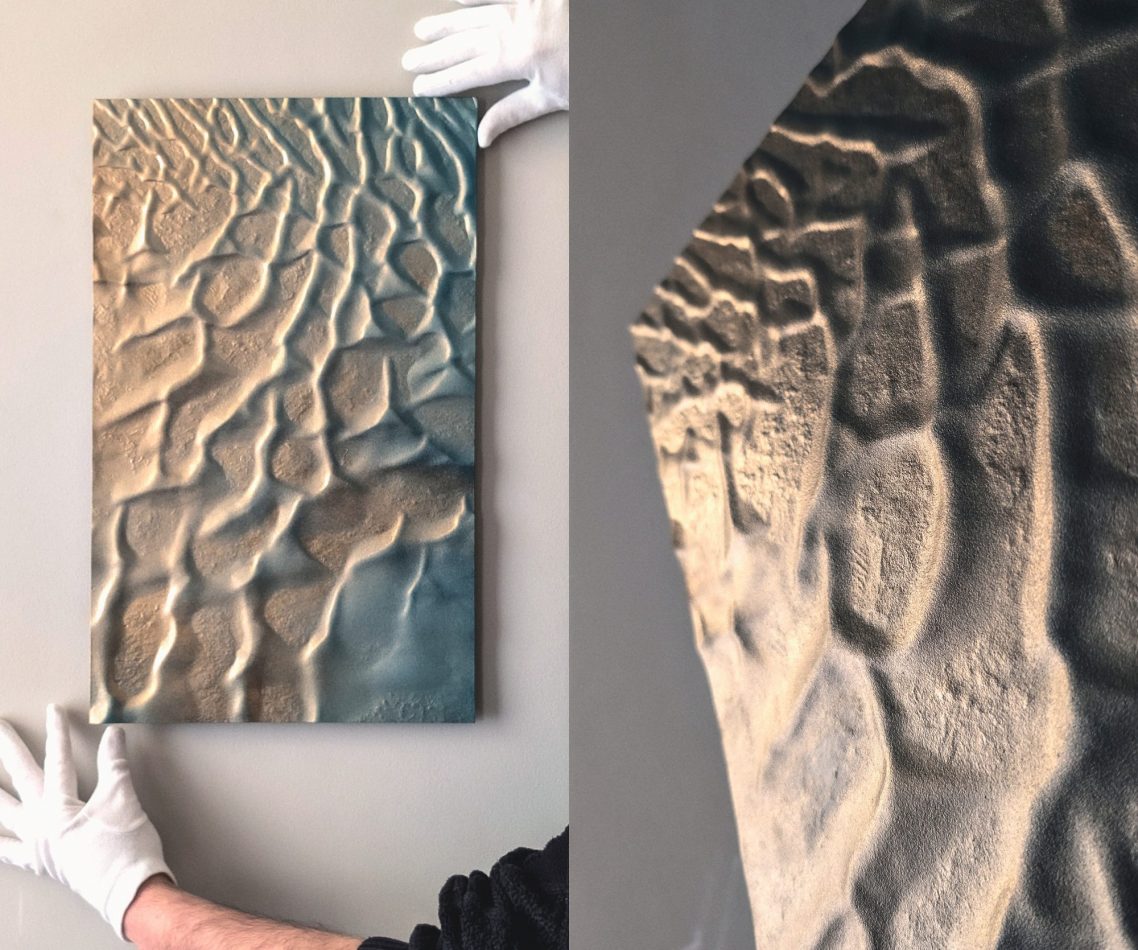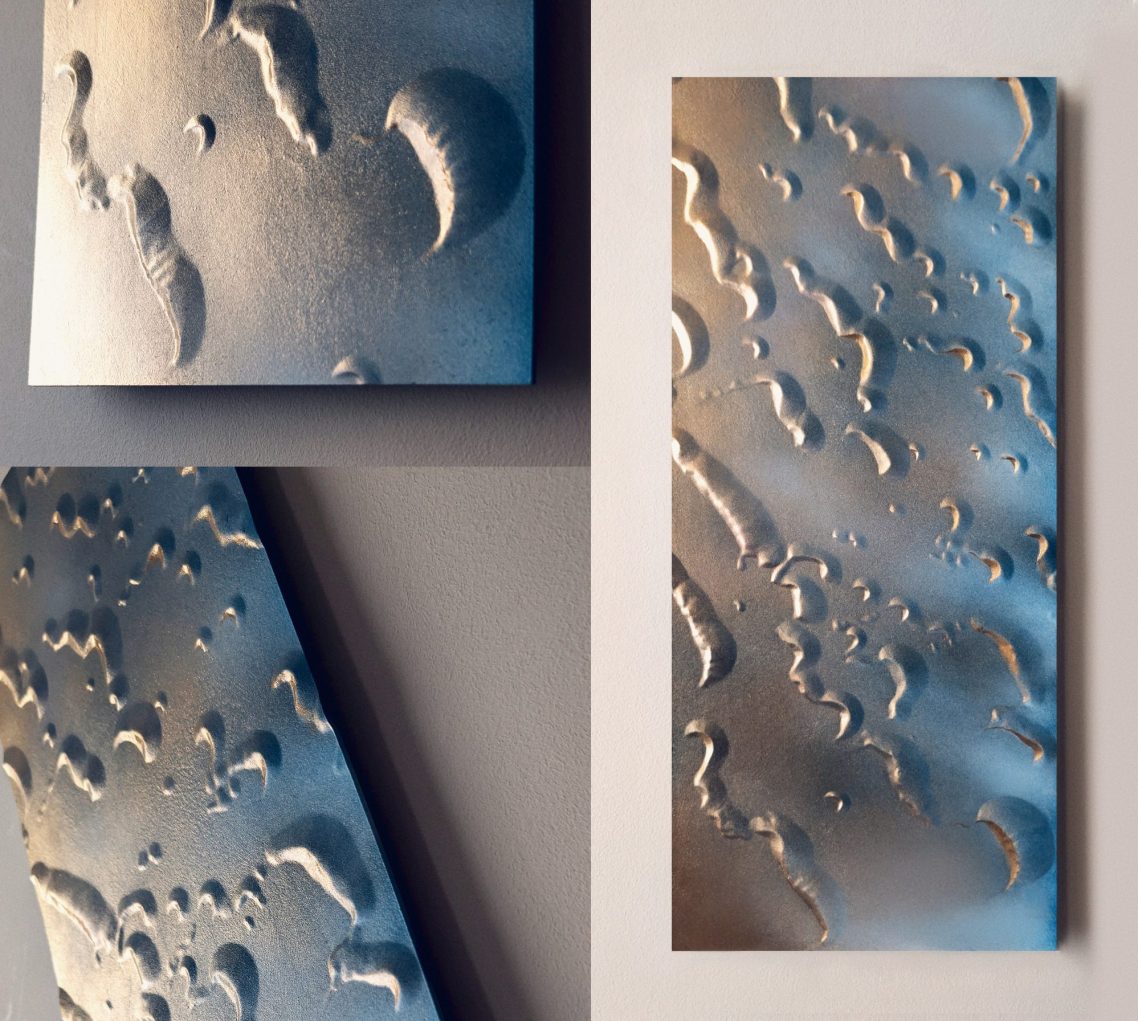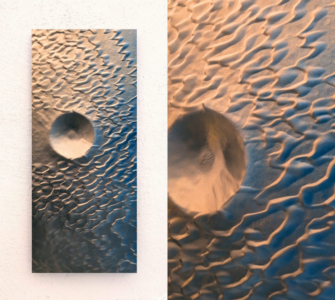 Mon approche artistique vise à capturer l'essence décorative du relief de ces dunes, en utilisant un dégradé de surface allant de l'or au bleu Lapis-lazuli. J’aspire à transmettre un sentiment de gratitude face à l’immensité de ces déserts inhospitaliers. Malgré les recherches à la surface de Mars, nous n’avons trouvé ni vers des sables, ni souris, ni microbes.