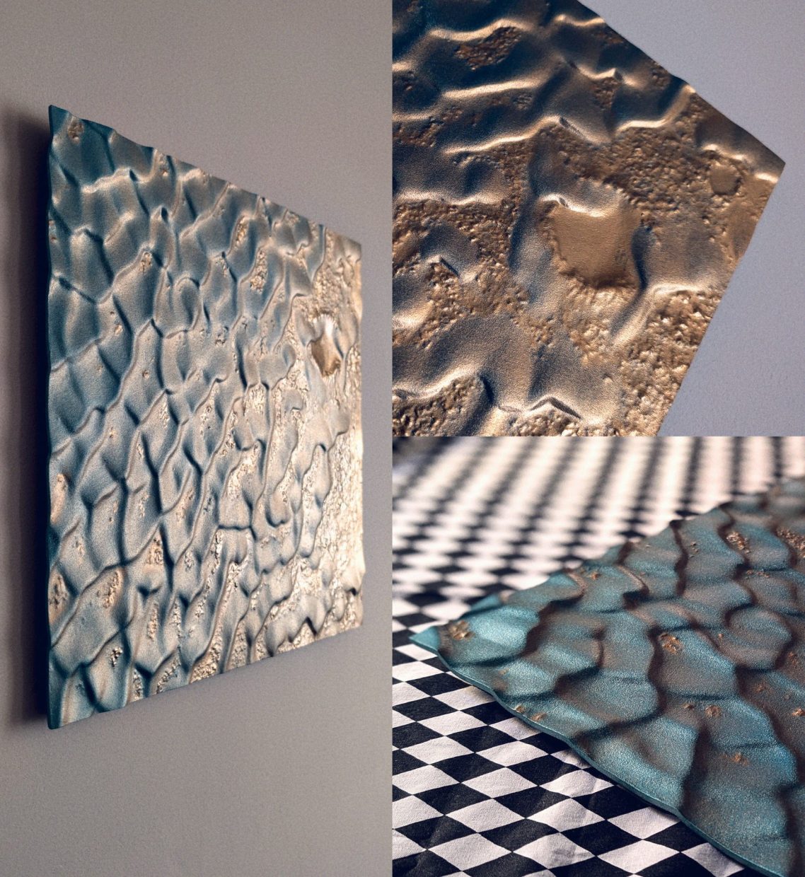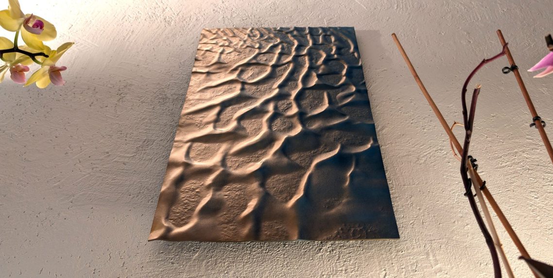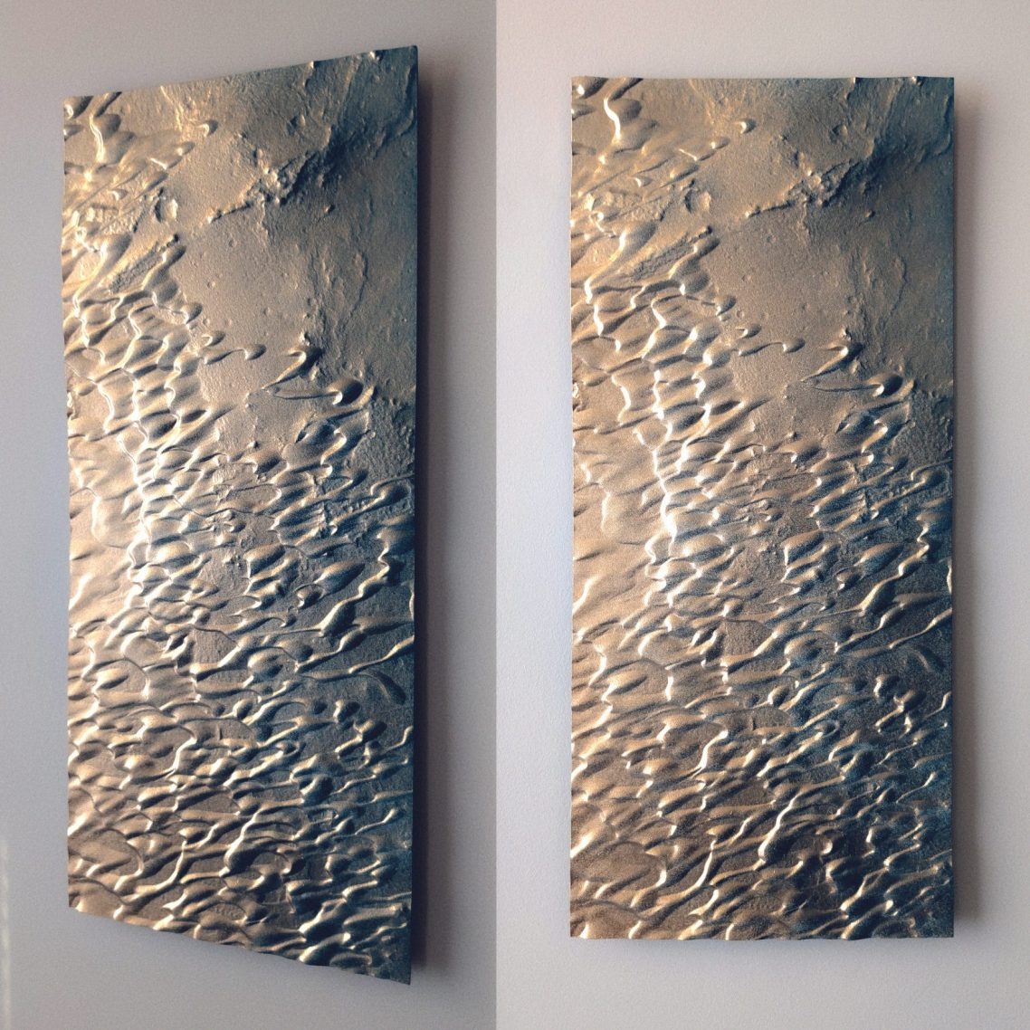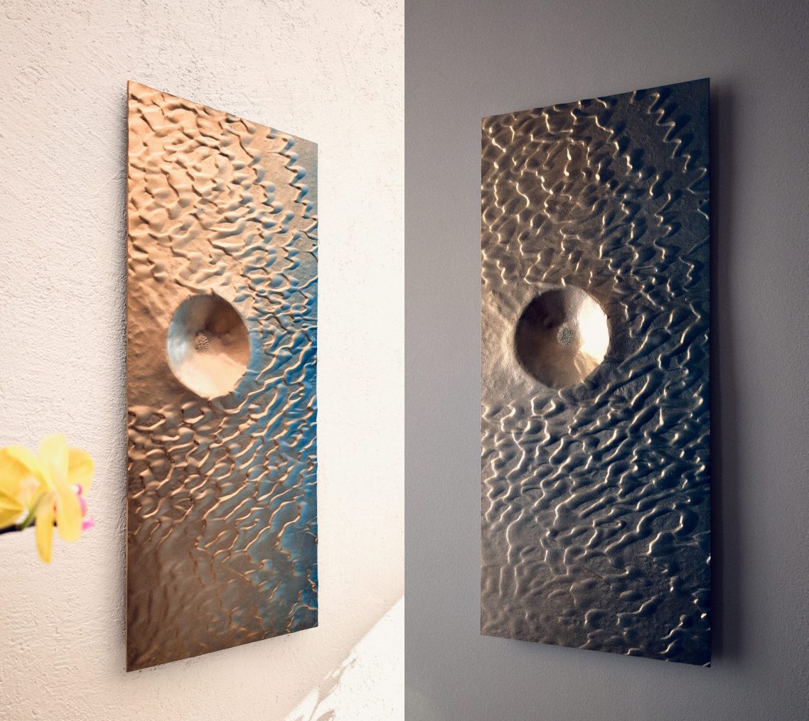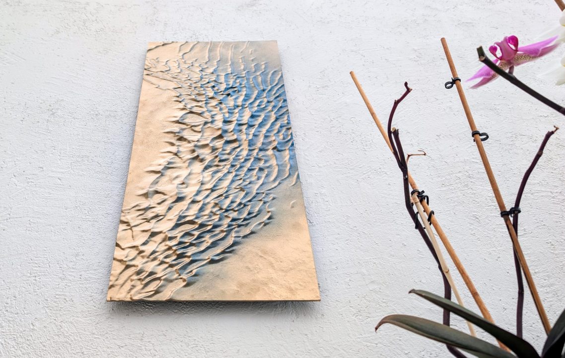 Mon approche artistique vise à capturer l'essence décorative du relief de ces dunes, en utilisant un dégradé de surface allant de l'or au bleu Lapis-lazuli. J’aspire à transmettre un sentiment de gratitude face à l’immensité de ces déserts inhospitaliers. Malgré les recherches à la surface de Mars, nous n’avons trouvé ni vers des sables, ni souris, ni microbes.