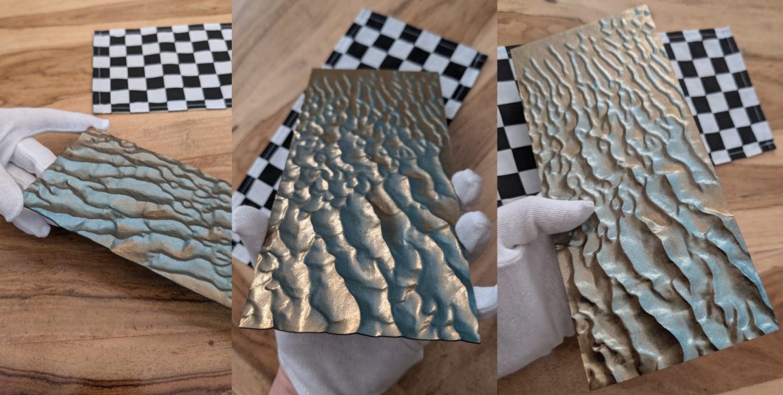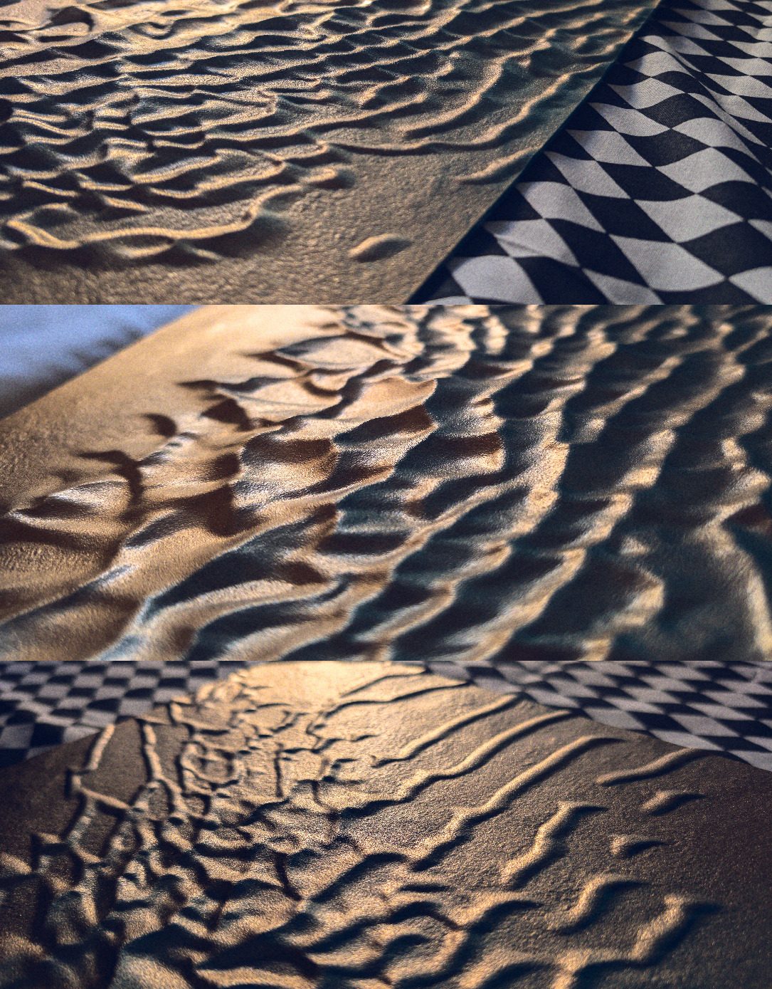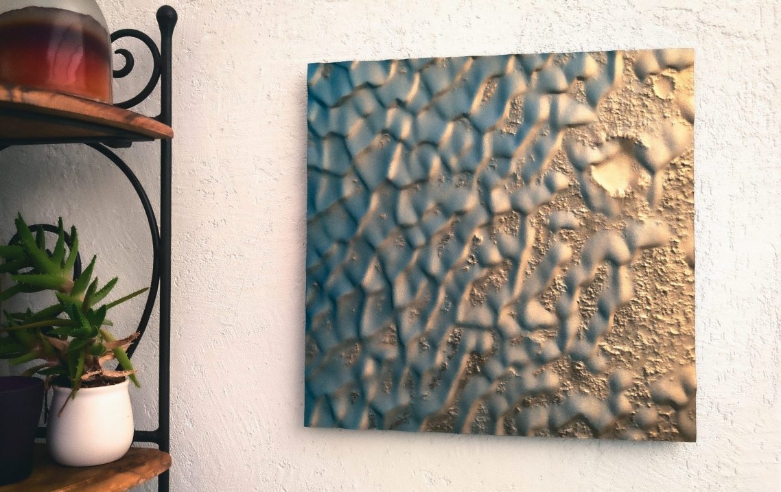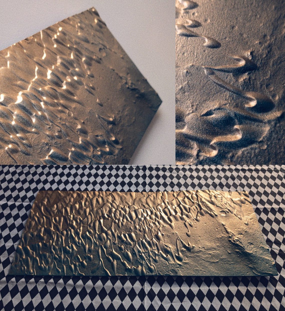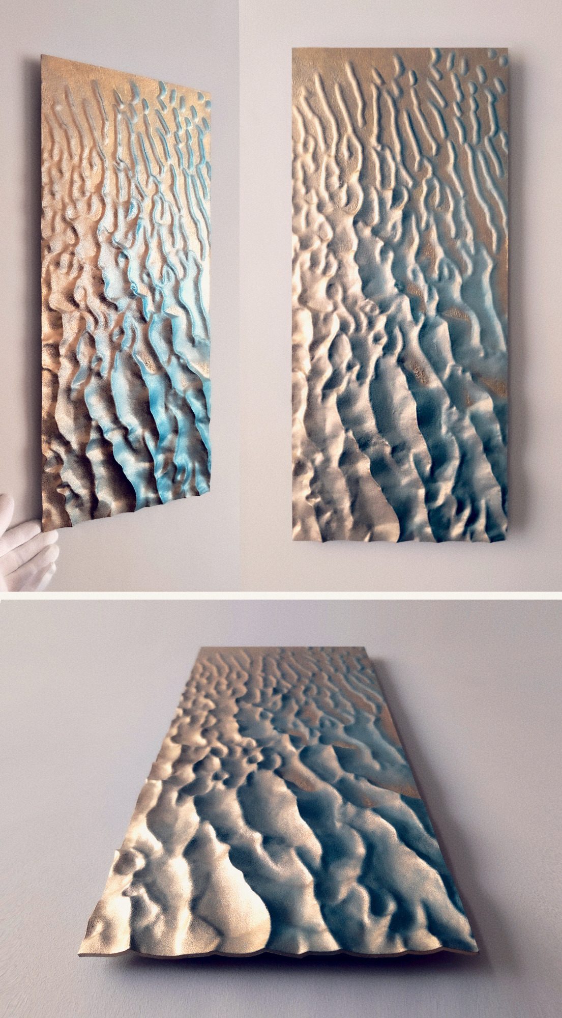 Mon approche artistique vise à capturer l'essence décorative du relief de ces dunes, en utilisant un dégradé de surface allant de l'or au bleu Lapis-lazuli. J’aspire à transmettre un sentiment de gratitude face à l’immensité de ces déserts inhospitaliers. Malgré les recherches à la surface de Mars, nous n’avons trouvé ni vers des sables, ni souris, ni microbes.