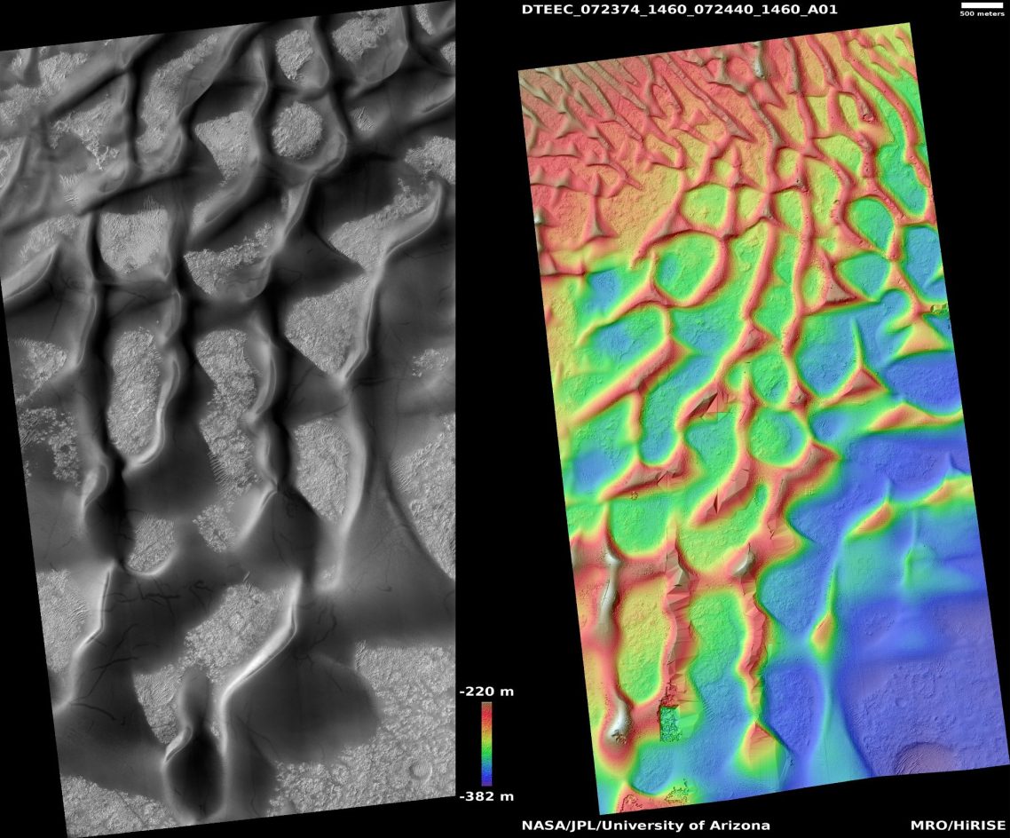 Ces 7 topographies des champs de dunes martiennes ont été capturées par l'instrument HiRISE, un télescope embarqué à bord de la sonde martienne MRO (Mars Reconnaissance Orbiter). Grâce à une résolution exceptionnelle d'un mètre par pixel, cet instrument révèle des détails fascinants de la surface de Mars, nous offrant une nouvelle perspective sur ces paysages.