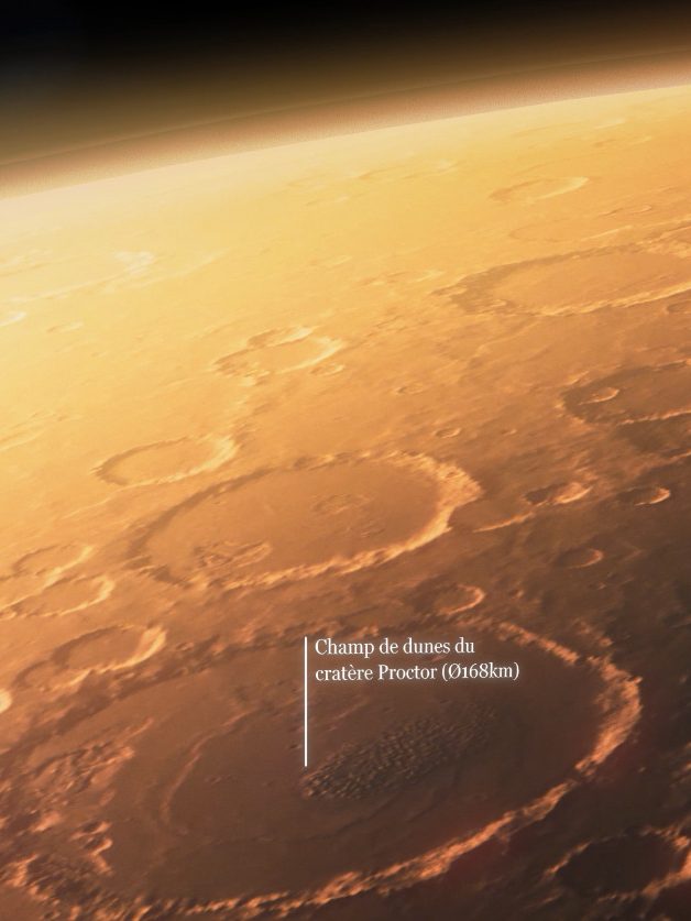 Les dunes du cratère Proctor, appelées seif (mot arabe signifiant "épée"), forment de longues étendues de sable longitudinales sur + 7km.